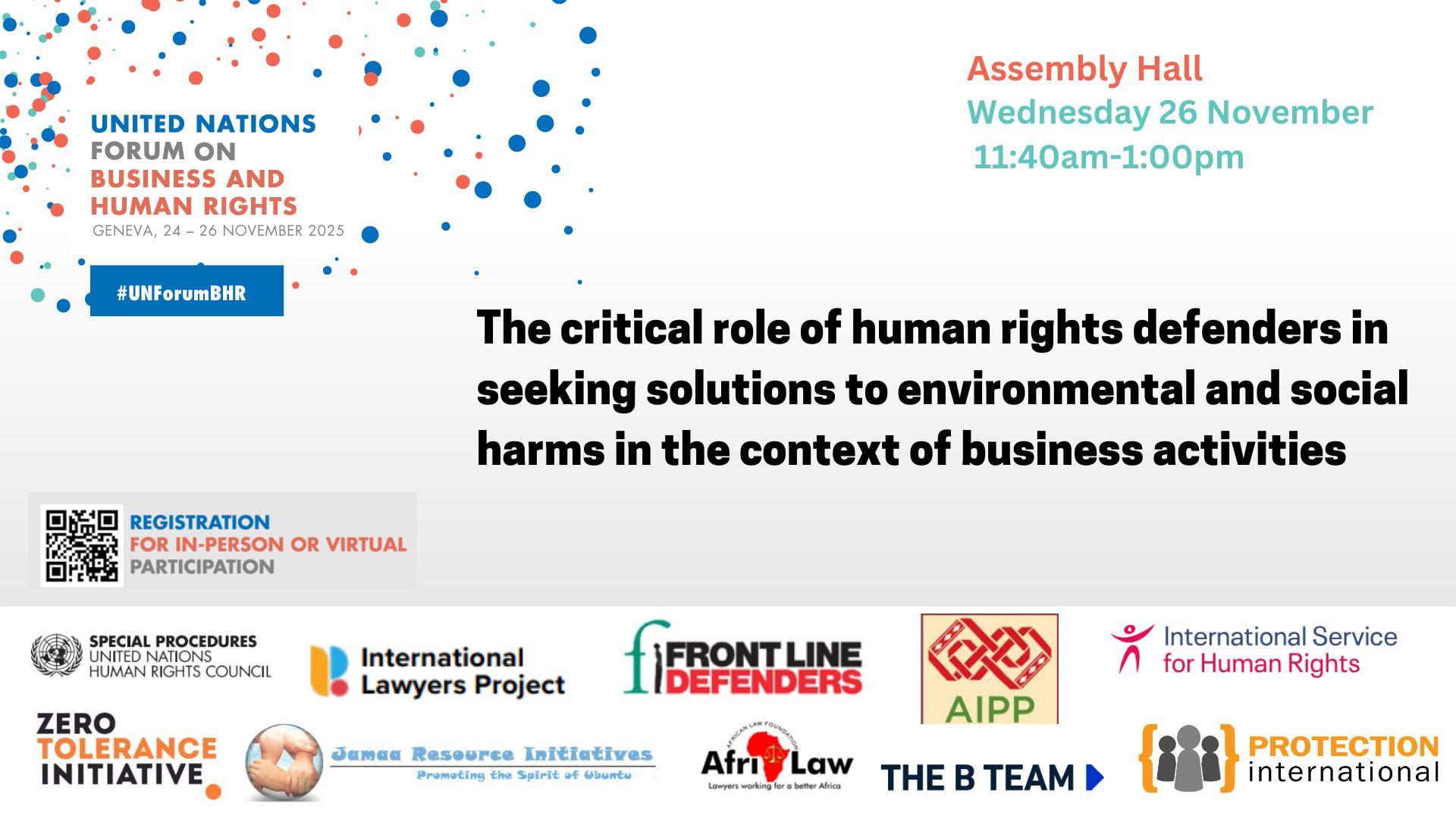 This event is organised by the Working Group on BHR, Zero Tolerance Initiative, Front Line Defenders, International Service for Human Rights, Asia Indigenous Peoples Pact, Jamaa Resource Initiatives, Protection International, International Lawyers Project, African Law Foundation and B Team.