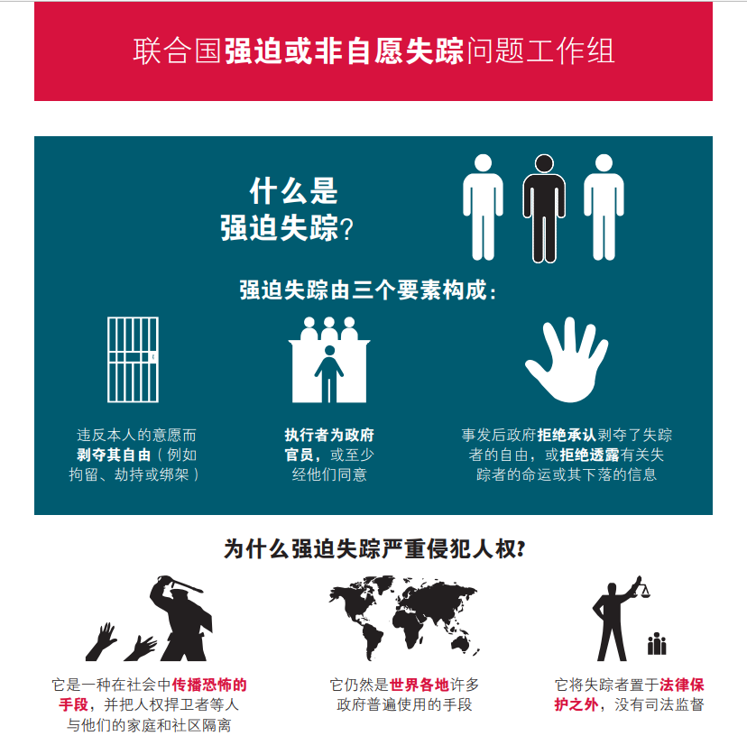 自2012年以来,全国人民代表大会通过并修改了刑事诉讼法中的几个条款,赋予警方可以让任何人失踪并关押到秘密地点的权力:这就是 “指定居所监视居住”(通常用英文称为 “RSDL”)。当这种情况发生时,这些人在长达6个月的时间里被剥夺与外界的所有联系,甚至与家人或律师也无法联系。没有人知道他们在哪里。这给他们的家人带来无尽的痛苦。失踪者受到审讯并经常遭受酷刑。与此同时,尽管他们的家人必须克服各种障碍和风险,但他们仍然坚持要求了解亲人的下落,坚持为他们所遭受的苦难寻求正义。